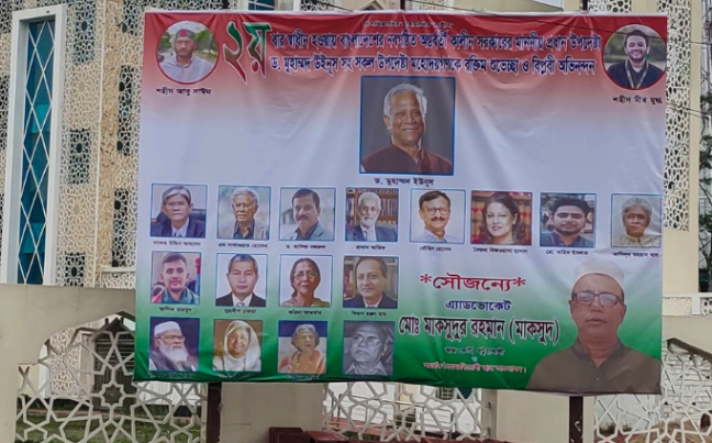 পটুয়াখালী: জেলার মডেল মসজিদের সামনে এবং জেলা প্রশাসক কার্যালয়ের পাশের গুরুত্বপূর্ণ স্থানে অন্তবর্তীকালীন সরকারের প্রধান উপদেষ্টা ড. মুহাম্মদ ইউনূস সহ অন্যান্য উপদেষ্টাদের ছবিসহ ব্যানার টাঙিয়ে বিতর্কের জন্ম দিয়েছেন এক বিএনপি নেতা। গত শুক্রবার, ৮ আগস্ট, অন্তবর্তীকালীন সরকার শপথ গ্রহণের পরদিনই ব্যানারটি টাঙানো হয়।