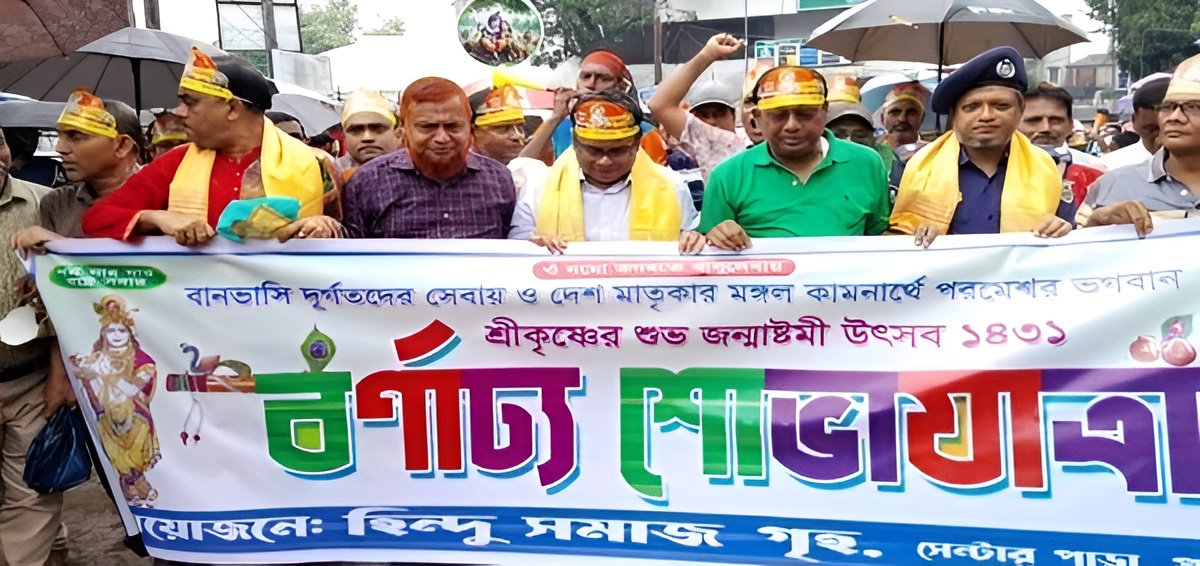 আলোচনা শেষে প্রধান অতিথি ও বিশেষ অতিথিবৃন্দ মঙ্গল প্রদীপ প্রজ্জ্বলন এবং বেলুন ও ফেস্টুন উড়িয়ে শোভাযাত্রার উদ্বোধন করেন। শোভাযাত্রায় হাতি, ঘোড়া এবং বাদ্যযন্ত্রসহকারে রঙিন সাজে সজ্জিত মানুষদের অংশগ্রহণ ছিল চোখে পড়ার মতো। শোভাযাত্রাটি বৃষ্টির মধ্যেও বিভিন্ন সড়ক প্রদক্ষিণ করে পুনরায় হিন্দু সমাজ গৃহ প্রাঙ্গণে এসে শেষ হয়।