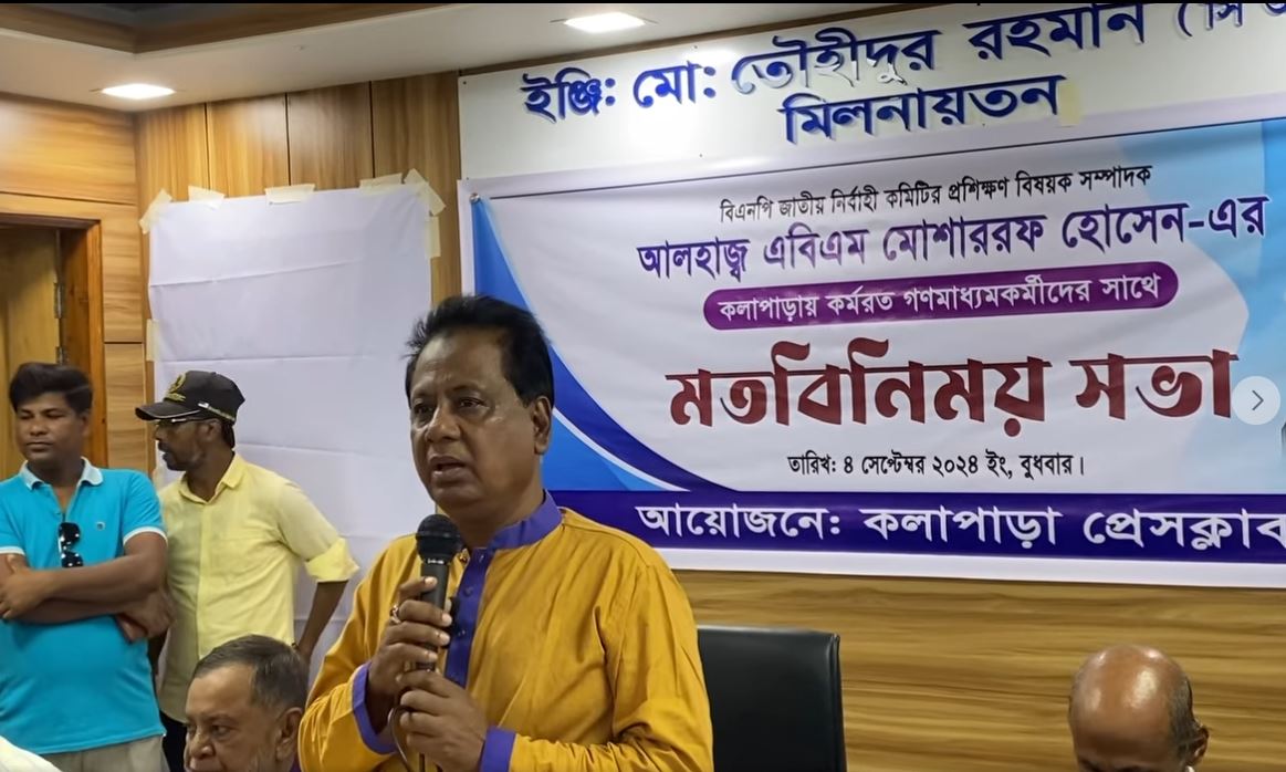 পটুয়াখালীর কলাপাড়ায় বুধবার সকাল ১১টায় স্থানীয় প্রেসক্লাব মিলনায়তনে কেন্দ্রীয় বিএনপির নির্বাহী কমিটির প্রশিক্ষণ বিষয়ক সম্পাদক আলহাজ্ব এবিএম মোশাররফ হোসেনের সাথে গণমাধ্যমকর্মীদের এক মতবিনিময় সভা অনুষ্ঠিত হয়। এই সভায় উপস্থিত ছিলেন কলাপাড়া প্রেসক্লাবের আহ্বায়ক হুমায়ূন কবির, উপজেলা বিএনপির সভাপতি হাজী হুমায়ুন সিকদার, সাধারণ সম্পাদক অ্যাডভোকেট হাফিজুর রহমান চুন্ন, সাংগঠনিক সম্পাদক খন্দকার নাসির উদ্দিন, পৌর বিএনপির সভাপতি ফারুক গাজী এবং সাধারণ সম্পাদক মুসা তাওহীদ নান্নু মুন্সি সহ বিএনপির বিভিন্ন স্তরের নেতাকর্মীরা।