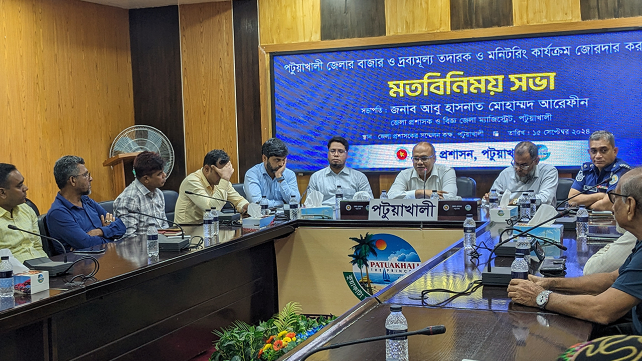 পটুয়াখালী জেলার বাজার ও দ্রব্যমূল্য মনিটরিং কার্যক্রম আরও জোরদার করতে একটি মতবিনিময় সভা অনুষ্ঠিত হয়েছে। রোববার (১৫ সেপ্টেম্বর) জেলা প্রশাসকের সম্মেলন কক্ষে জেলা প্রশাসনের আয়োজনে এই সভাটি অনুষ্ঠিত হয়। এতে সভাপতিত্ব করেন পটুয়াখালী জেলার নবাগত জেলা প্রশাসক আবু হাসনাত মোহাম্মদ আরেফীন।