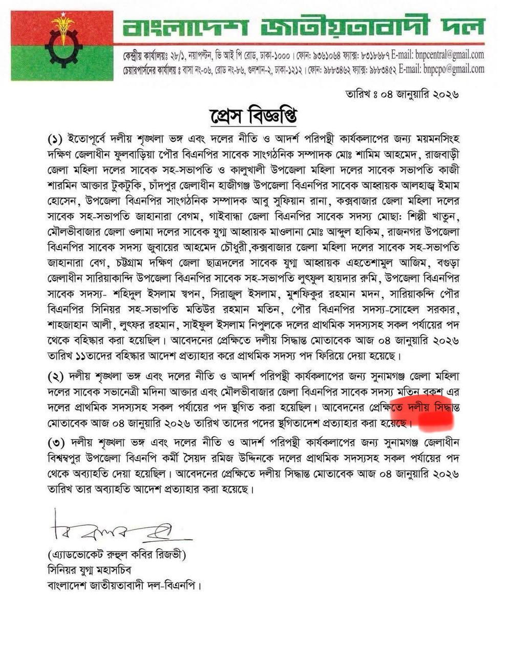 মৌলভীবাজার জেলা বিএনপি’র সাবেক সাংগঠনিক সম্পাদক মতিন বকশের দলের প্রাথমিক সদস্যপদ সহ সকল পর্যায়ের পদের স্থগিতাদেশ প্রত্যাহার করা হযেছে। সোমবার (৪ঠা জানুয়ারি) বিএনপি’র কেন্দ্রীয় সিনিয়র যুগ্ম মহাসচিব রুহুল কবির রিজভী ...বিস্তারিত পড়ুন