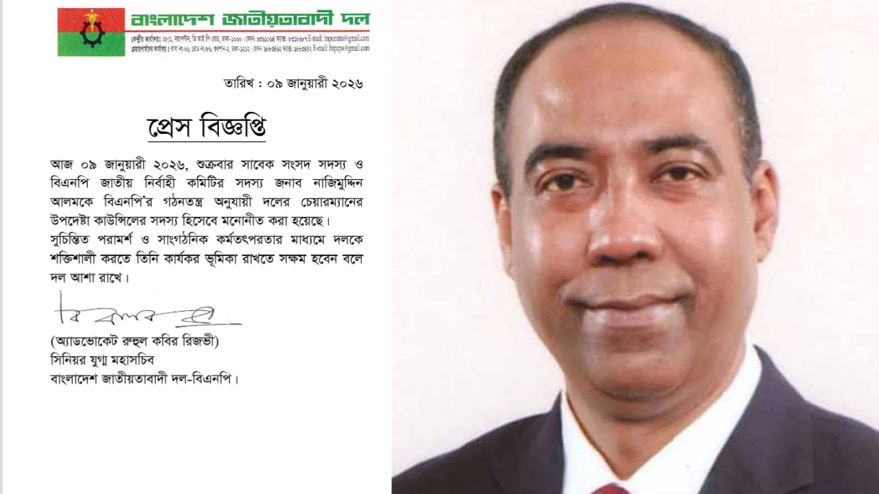 বিএনপি চেয়ারম্যানের উপদেষ্টা কাউন্সিলের সদস্য হিসেবে মনোনীত হয়েছেন দলের জাতীয় নির্বাহী কমিটির সদস্য ও সাবেক সংসদ সদস্য নাজিমুদ্দিন আলম। শুক্রবার (৯ জানুয়ারি) বিএনপির গঠনতন্ত্র অনুযায়ী তাঁকে এ দায়িত্ব দেওয়া হয়। ...বিস্তারিত পড়ুন