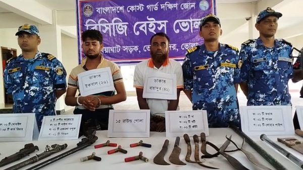 ভোলার মেঘনা নদীর বঙ্গের চর থেকে দেশীয় অস্ত্র,গোলাবারুদ ও নগদ টাকা সহ দুই ডাকাতকে আটক করেছেন কোস্ট গার্ড দক্ষিণ জোন। এ ব্যাপারে আজ দুপুরে কোস্টগার্ড কার্যালয়ে সংবাদ সম্মেলন করেণ, লেঃ