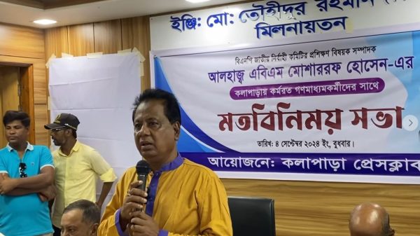 পটুয়াখালীর কলাপাড়ায় বুধবার সকাল ১১টায় স্থানীয় প্রেসক্লাব মিলনায়তনে কেন্দ্রীয় বিএনপির নির্বাহী কমিটির প্রশিক্ষণ বিষয়ক সম্পাদক আলহাজ্ব এবিএম মোশাররফ হোসেনের সাথে গণমাধ্যমকর্মীদের এক মতবিনিময় সভা অনুষ্ঠিত হয়। এই সভায় উপস্থিত ছিলেন